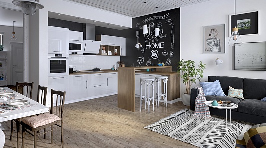 Еще одно преимущество этого цвета – его универсальность. Оформляя интерьер, вы можете использовать абсолютно любые дополнительные оттенки – белый прекрасно сочетается со всеми другими красками. Например, можно придать помещению подчеркнуто стильный вид, выдержав его в спокойной бело-бежевой или бело-серой цветовой гамме. А можно создать жизнерадостную и бодрящую атмосферу, внеся в интерьер яркие акценты в виде красочного кухонного фартука-скинали, цветных обоев и занавесок.