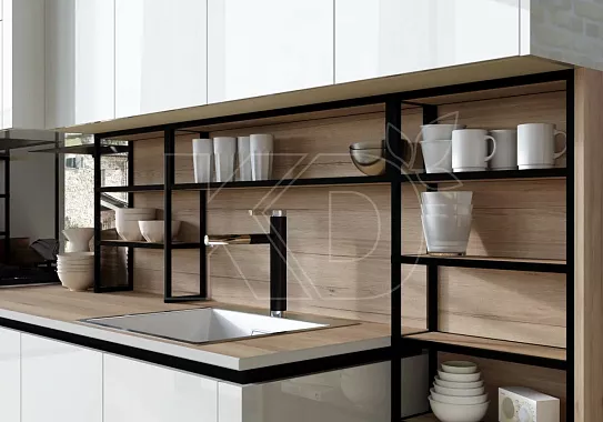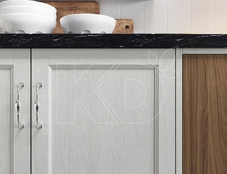 Светлые породы типа ясеня и беленого дуба в сочетании с белыми фасадами выглядят спокойно и невыразительно, но такое решение может подойти тем, кто хочет сделать стены или потолок максимально акцентными и добавить большое количество декора.