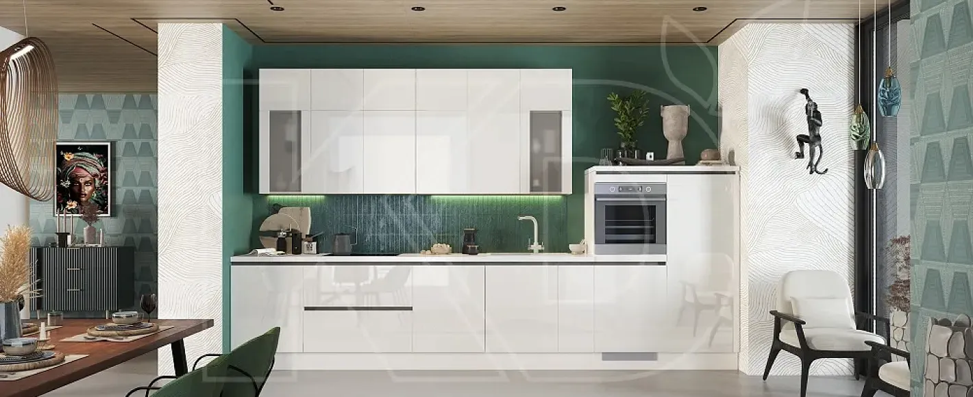 При выборе гарнитура обязательно учитывайте его планировку. Именно от этого зависит, насколько гармонично мебель впишется в пространство. В небольших и средних комнатах обычно устанавливают угловые и линейные комплекты. При этом высокие модули размещают у стен, которые находятся далеко от окна. Такая расстановка обеспечивает комфортный доступ к содержимому шкафов. Ближе к окну следует установить мойку, плиту, столешницу, потому что готовить удобнее при хорошем дневном освещении.