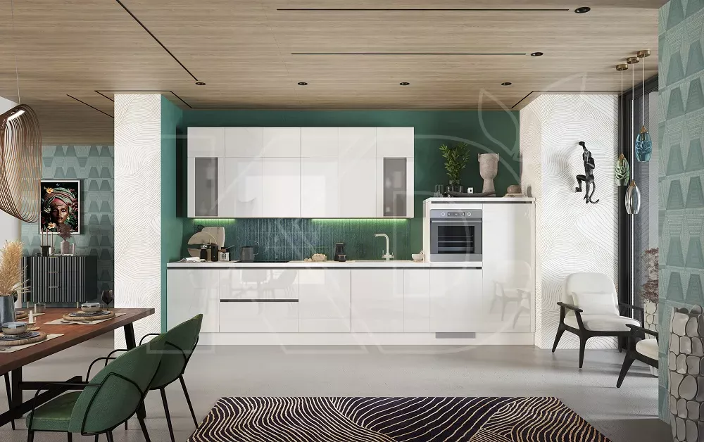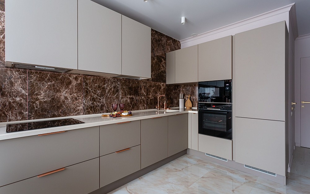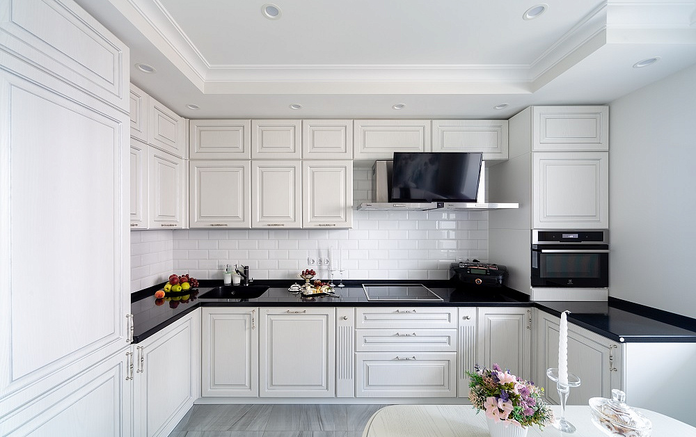 Неоклассика – еще одно направление, которое используется при оформлении кухонных интерьеров в 2023 году. Для этого стиля характерно сочетание современных деталей с классическим дизайном. Так, прямые строгие фасады, благородные спокойные оттенки комбинируются с продуманными системами хранения.