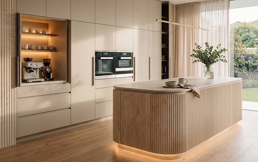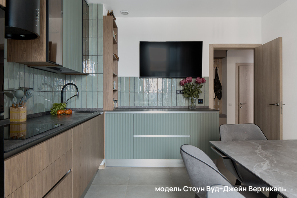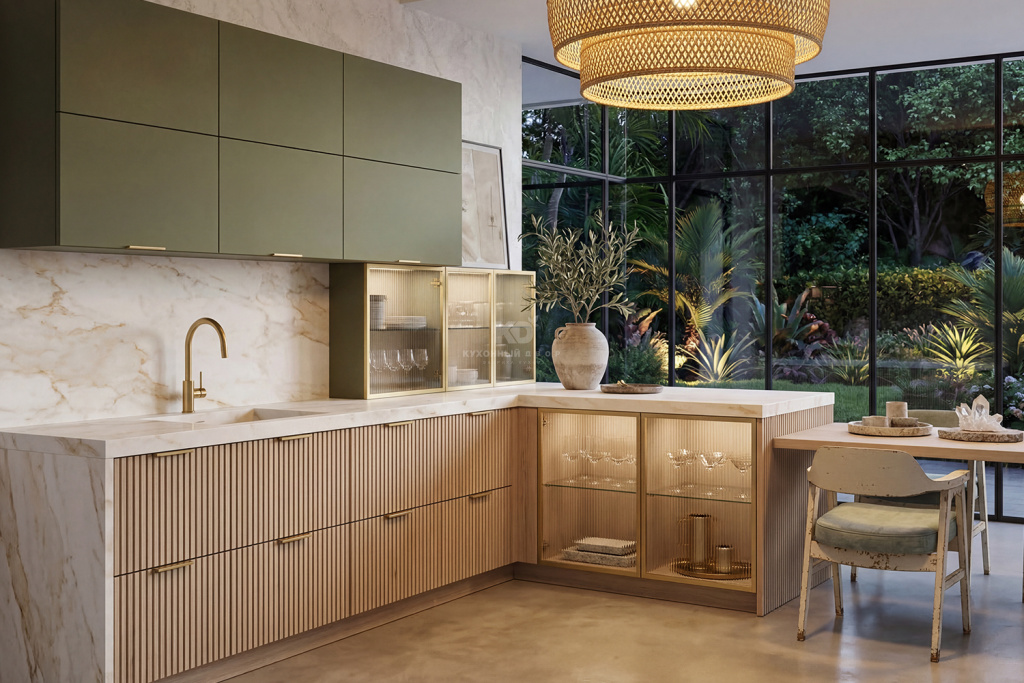 Рифлёные поверхности, бархатистое покрытие Мягкое прикосновение (Soft Touch) и тепло натурального дерева добавляют интерьеру глубины и тактильности. К таким материалам хочется прикасаться — они делают пространство живым, наполненным ощущениями и комфортом. Именно за счёт этих деталей кухня превращается из функциональной зоны в по-настоящему уютное место притяжения для всей семьи.