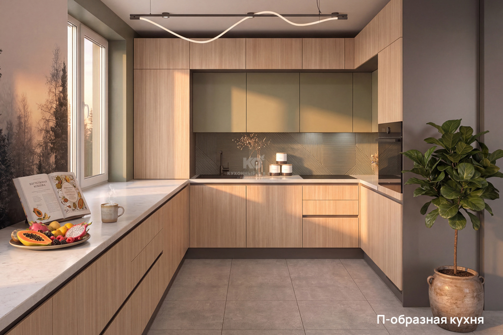 • П-образная компоновка идеально подходит для активной готовки: она обеспечивает максимум рабочей поверхности и вместительное хранение, превращая кухню в организованное пространство, где всё под рукой.