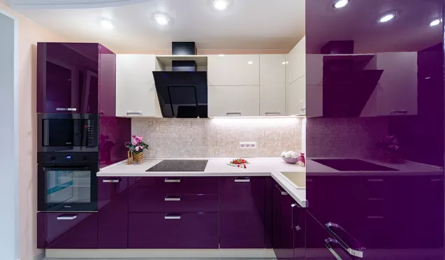 • Богатая палитра оттенков. В глянце выполняют яркие, светлые и темные кухни.