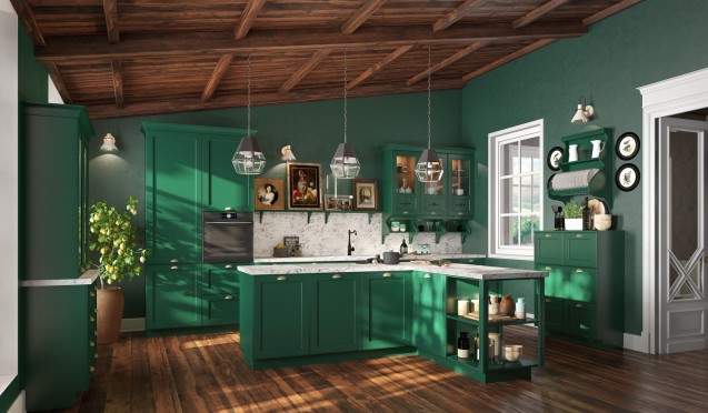 При выборе цвета предпочтение следует отдать светлой палитре. Хорошо будут смотреться версии с кремовыми, бежевыми, молочными фасадами. Так как стиль кантри предполагает использование естественных оттенков, можно декорировать поверхности элементами светло-коричневого, хвойного или фисташкового цвета.