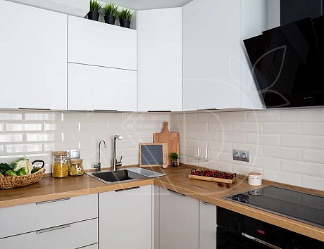 • Угловая. Это самое распространенное решение. Угловая кухня позволяет грамотно разместить рабочую зону и места для хранения таким образом, чтобы хозяйке было удобно перемещаться по комнате.