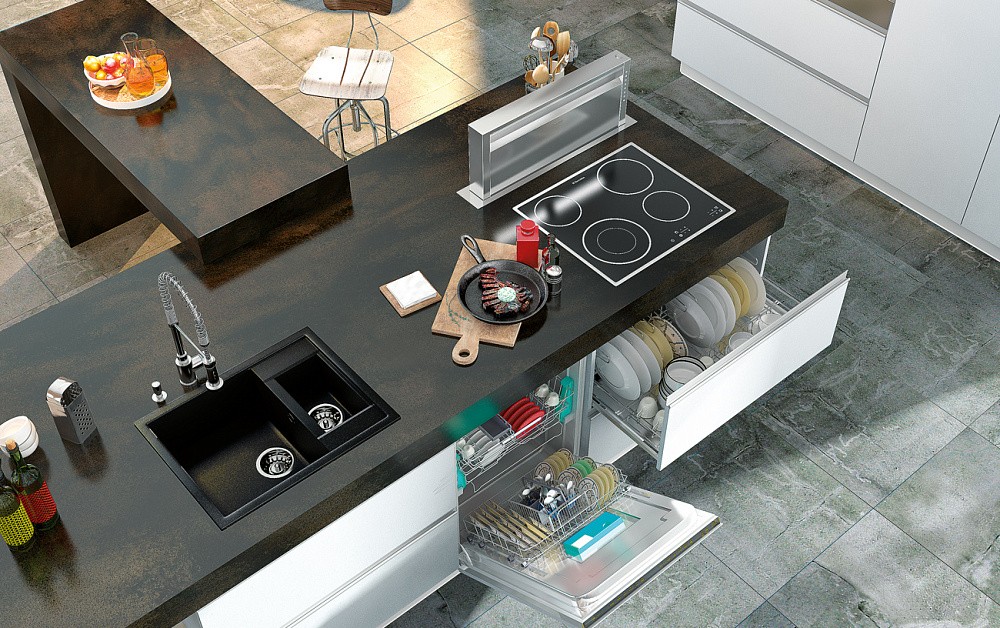 Рабочая поверхность эксплуатируется ежедневно – на ней режутся овощи и фрукты, смешиваются салаты, готовятся ингредиенты для первых и вторых блюд, размещается посуда и различные приспособления. Поэтому столешница должна выдерживать длительные механические нагрузки, а также воздействие влаги и бытовой химии.