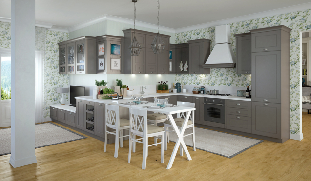 П-образные кухни. Модули таких комплектов занимают место сразу возле трех смежных стен. Это подходящий вариант для большой площади. Большое количество рабочих площадей, ящиков, открытых и закрытых полок обеспечивает повышенное удобство во время готовки.