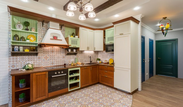 Создать уютный интерьер позволяют кухни кантри со светло-коричневыми и бежевыми фасадами. Помещения с подобными комплектами лучше обыграть соответствующими элементами – текстильными ковриками, ситцевыми занавесками и глиняной посудой.
