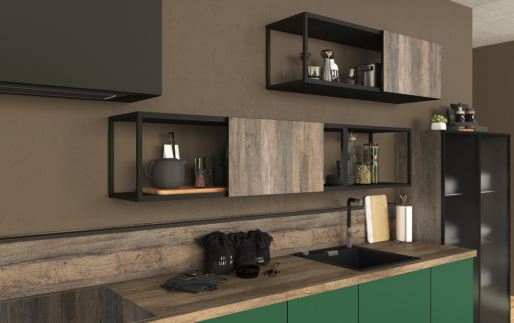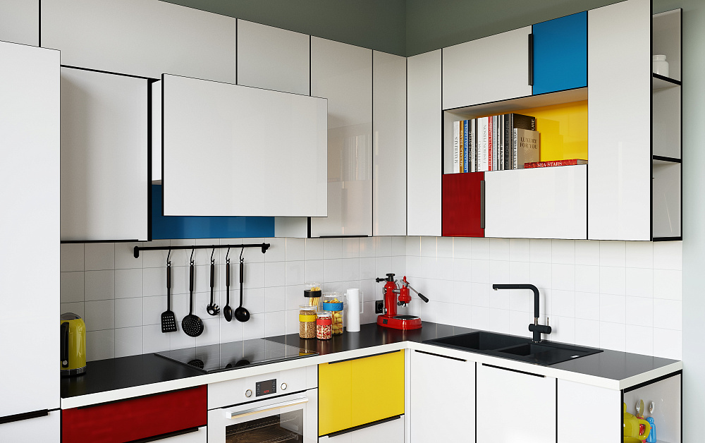 • кухонный гарнитур с контрастными решениями, фигурными вставками на дверцах и раздвижных створках;