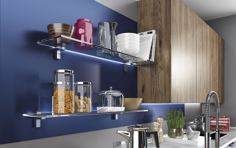 • сборку со встроенными витринами и светодиодной точечной подсветкой лаконичных фасадов;