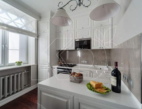 Получить максимум пользы на классической кухне с барной стойкой помогут держатели для посуды, шейкер, соковыжималка и другие бытовые приборы.