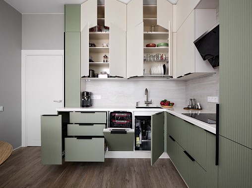 Для компактных кухонь каждая деталь имеет значение. Узкие проходы, выступающие стены, ниши и трубы требуют точного проектирования. Стандартные гарнитуры не всегда подходят — их приходится подрезать или менять расположение шкафов, что снижает функциональность.