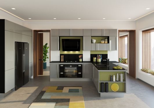 Для большой площади, например, в загородном доме, подходит вариант со шкафами, располагающимися вдоль трех стен. Планировка в виде буквы «П» отличается большим количеством рабочих поверхностей, что позволяет готовить большой компанией или всей семьей. Также П-образные кухни оснащают большим количеством выдвижных ящиков, закрытых и открытых полок, различных секций.