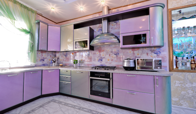 В том случае, если вы решили оформить кухню в фиолетовых тонах хамелеона, стоит обратить внимание на сиреневые и оранжевые оттенки в оформлении других элементов помещения. Некоторые детали должны быть светлыми. Например, подвесные потолки можно сделать ярко-белыми, добавить вытяжку или оформить ручки в светлых тонах. Также не рекомендуется оформлять пол и стены в темных тонах, так как это визуально сделает кухню менее просторной.
