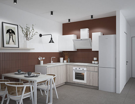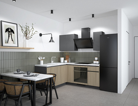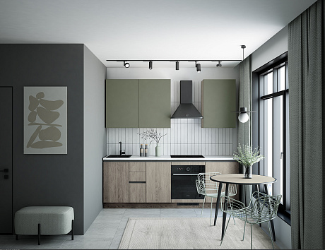 Особенность модели — выразительное двухцветное исполнение. Матовые однотонные фасады сочетаются с фактурой натурального дерева, создавая уютную и сбалансированную композицию. Такой дизайн делает кухню универсальной: она легко впишется в любой интерьер — от скандинавского до современного минимализма.