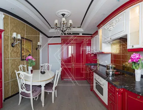 Неоклассицизм не приветствует мебель обтекаемых форм, все линии должны быть четкими. Из декоративных элементов допускается разве что минимальная фаска. Витраж допустим только с использованием прозрачного стекла. Кухонный гарнитур лучше выбрать из натурального дерева или МДФ, стилизованного под натуральную древесину. В условиях ограниченного бюджета разумнее остановиться на мебели из шпона.