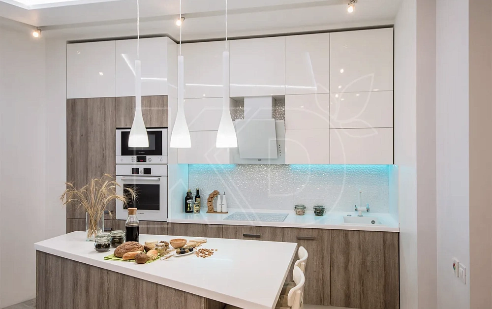 Барная стойка может использоваться в качестве дополнительной рабочей поверхности или обеденного стола. Другой плюс такой конструкции заключается в том, что она может использоваться для зонирования пространства.