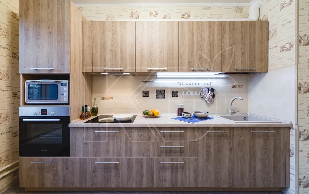 Данная планировка подходит для небольших комнат. Модули такого гарнитура займут место возле одной стены, не перегружая помещение. У прямой конфигурации кухни есть и другие преимущества: