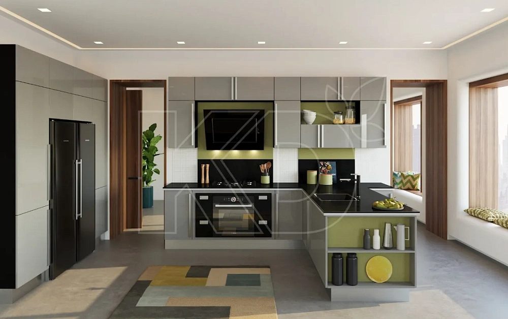 Планировка, при которой модули располагаются в виде буквы «П» вдоль трех смежных стен, обычно используется в больших помещениях. Подобное расположение считается одним из наиболее эргономичных, потому что позволяет придерживаться принципа рабочего треугольника. Холодильник, плита и мойка размещаются на одинаковом друг от друга расстоянии.