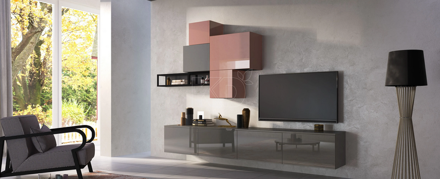 Придать выразительность фасадам и зрительно увеличить площадь небольшой гостиной поможет мебель с покрытием из отражающей свет белой, бежевой, светло-серой ультраглянцевой эмали. Создать ощущение легкости в интерьере и усилить иллюзию свободы и простора помогут такие дизайнерские решения, как комбинация глухих фасадов с асимметричными открытыми полочками, а также отсутствие цоколей – благодаря этому будет казаться, что гостиная буквально парит в воздухе.