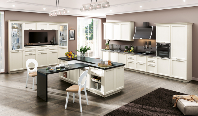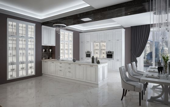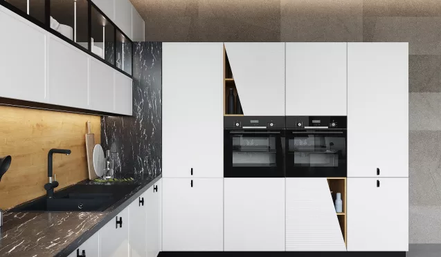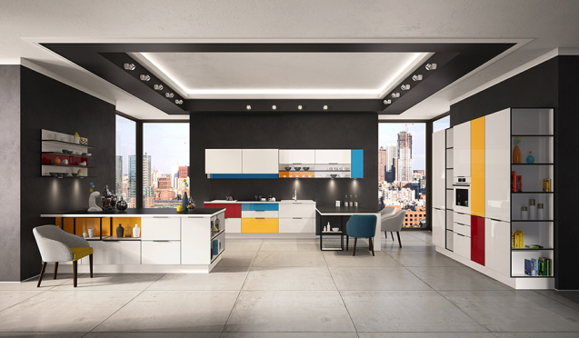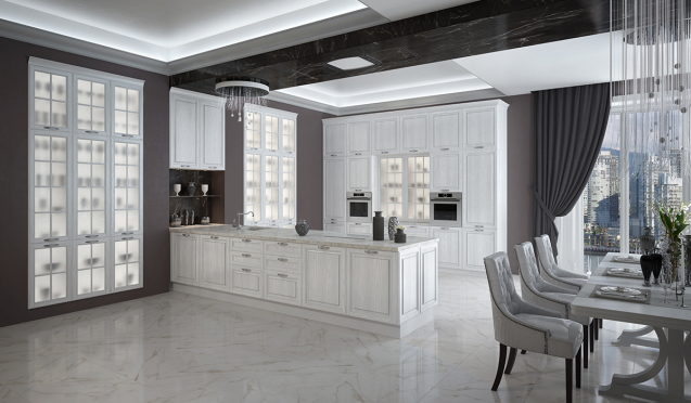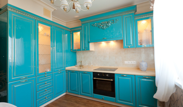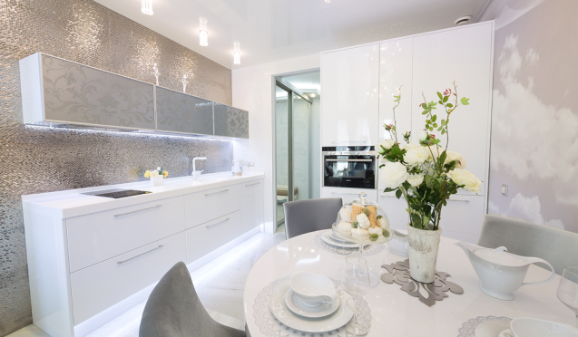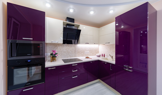 На первом этапе необходимо выбрать цвет стен, потолка и пола. Понять, какими будут фасады гарнитура – глянцевыми или матовыми, плоскими или филенчатыми.