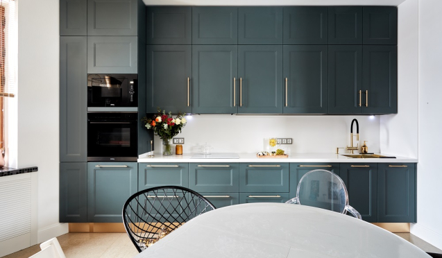 После завершения отделочных работ можно приступать к сборке и установке кухонной мебели. Выполнить это можно самостоятельно, но лучше всего обратиться к специалистам. Они быстро и правильно соберут комплект, интегрируют его в пространство, установят столешницу и мойку.