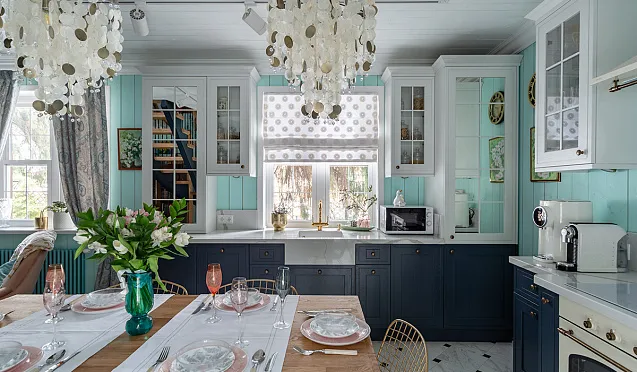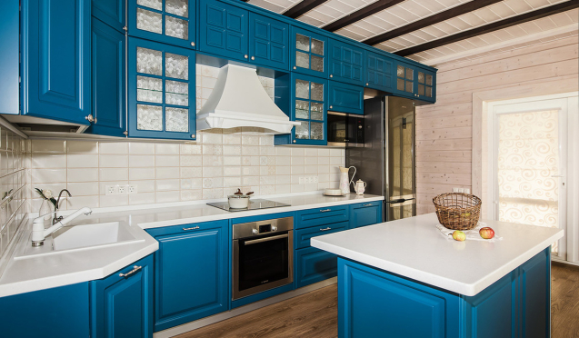 • Более авангардные решения, в которых на фасадах мебельного гарнитура применяются вставки из натурального дерева или белые блоки – смотрятся более свежо в любой обстановке вне зависимости от степени освещенности. Они понравятся почитателям стилей прованс, эклектика и модерн.