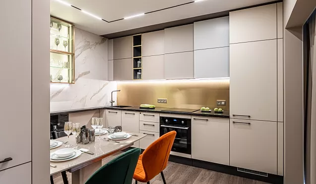 2. Экоплита Egger в сборке кухонного гарнитура с ламинированием заготовок с обеих сторон – идеальное решение для небольшой кухни, которую хочется расширить.