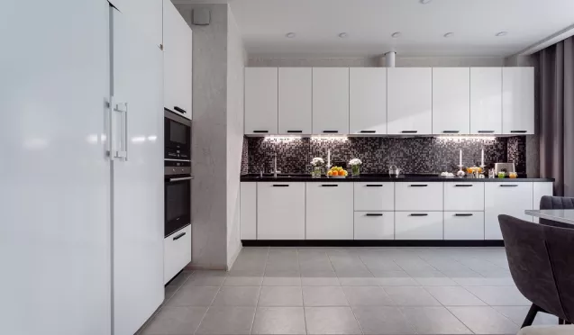 1. Самыми эффектными кухнями на 2023 год считаются модели с контрастным сочетанием блоков, выполненные из экологичных материалов в комплектации фасадов из МДФ и экомембраны со стилизацией под светлое и темное дерево.