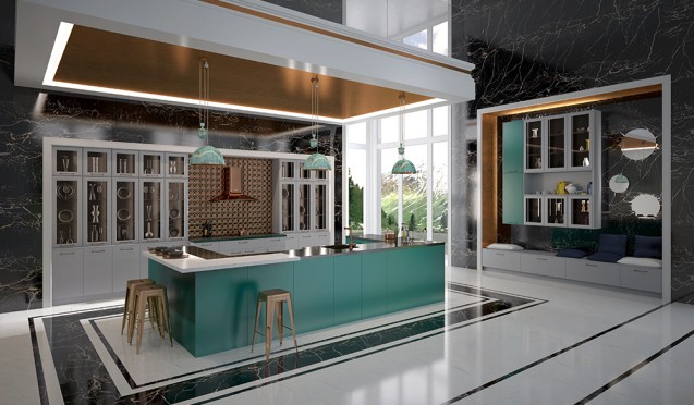 Например, для помещения больших размеров с высокими потолками подойдет классическая зеленая кухня. Подобные гарнитуры обычно выполняют в изумрудных, малахитовых, коричнево-зеленых тонах. Для их декоративного оформления используют резные узоры, лепнину, позолоту, патину.