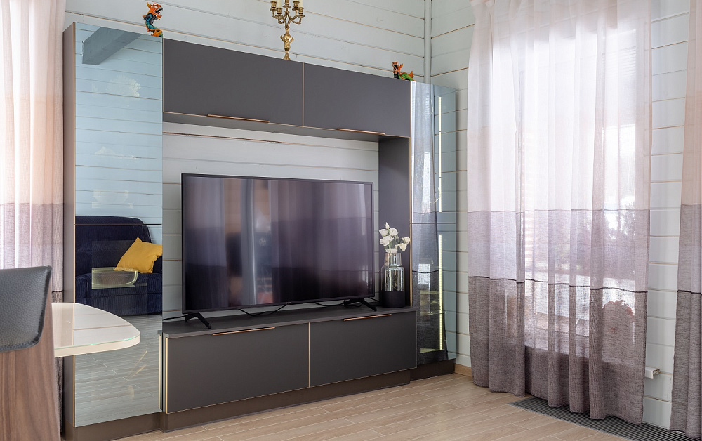 Стремясь сохранить лёгкость и ощущение простора в доме, наши дизайнеры создали TV-зону, стильную снаружи и функциональную внутри! Зона имеет два типа фасадов: «бархатистые» с покрытием «Extra Touch Matt» и почти «зеркальные», с высокой степенью светоотражения. Благодаря такому сочетанию гостиная выглядит «дорого» и презентабельно, сохраняя при этом лёгкость и лаконичность! А чтобы подчеркнуть её люксовый облик, торцевые части фасадов имеют стильные металлизированные акценты.