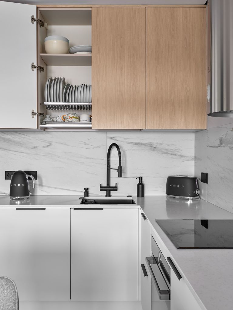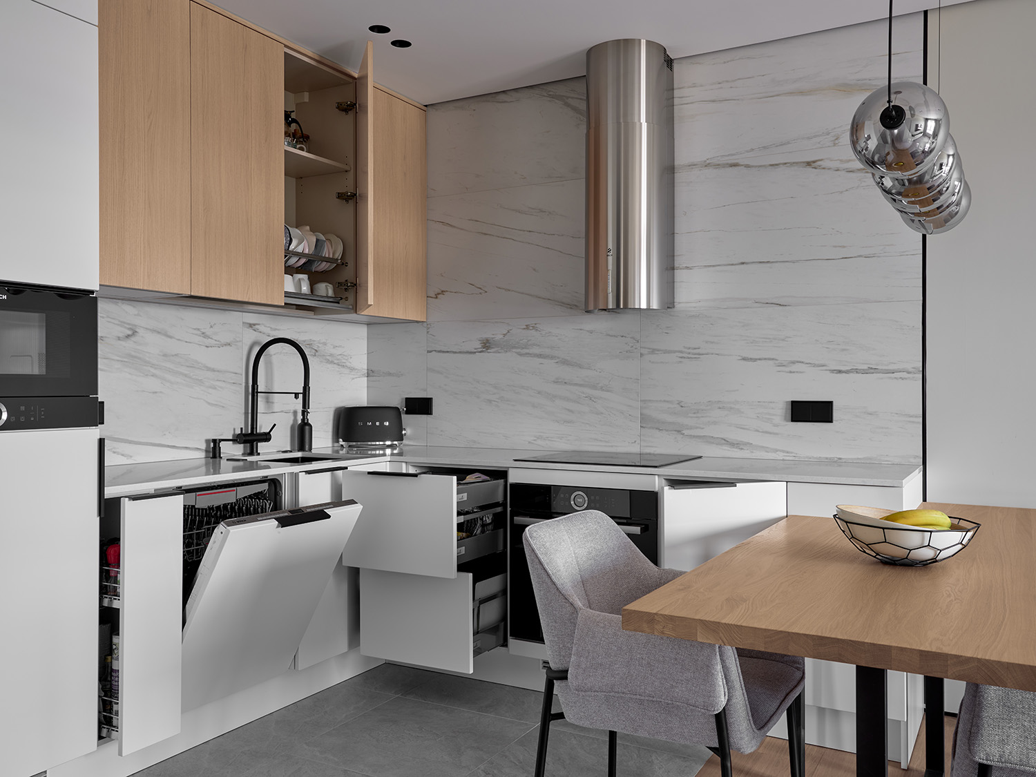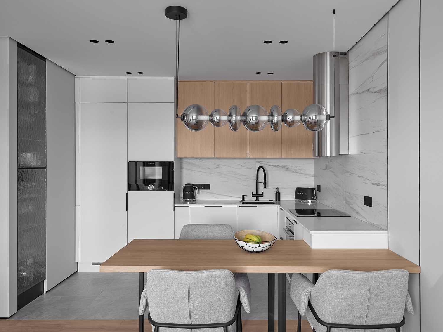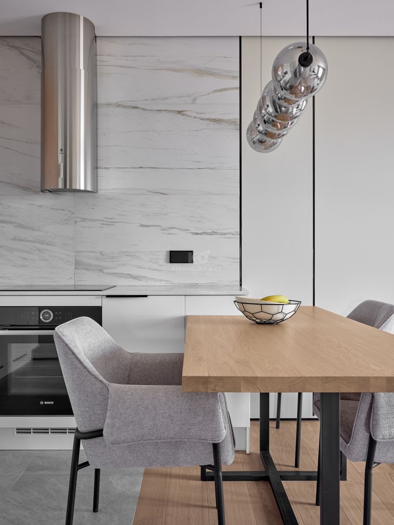 Главным архитектурным решением стала угловая рабочая зона: с одной стороны её формируют фасады под светлое дерево, а с другой — мы намеренно отказались от верхних шкафов. Это решение добавило пространству воздуха. Единственным акцентом здесь выступает мощная цилиндрическая вытяжка из нержавеющей стали, которая выглядит как футуристический арт-объект на фоне стены, декорированной крупноформатным керамогранитом под мрамор.