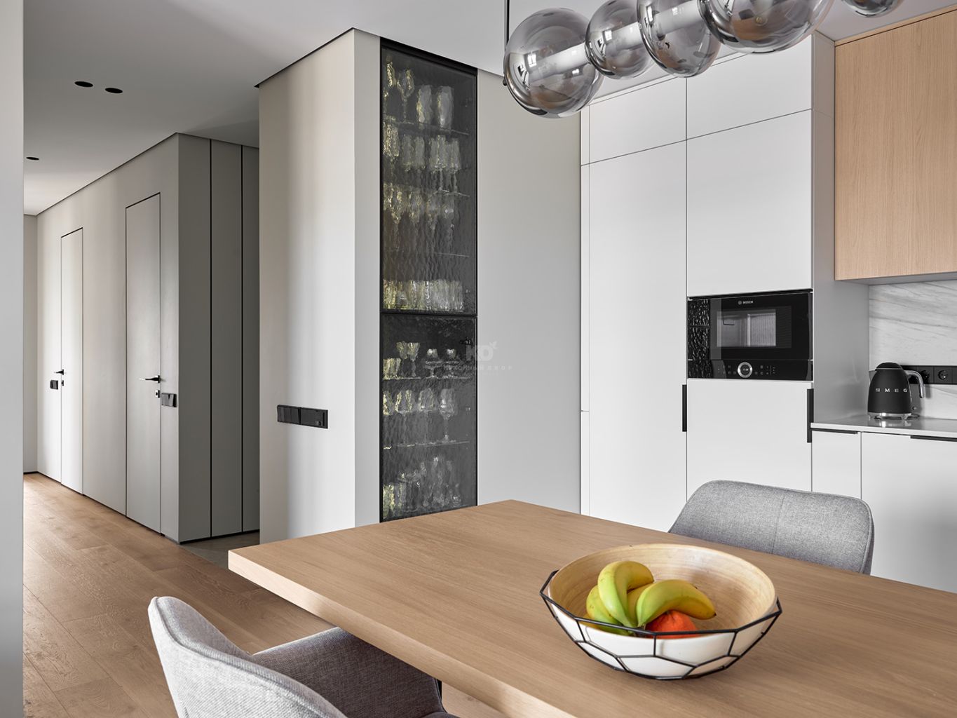 Слева в нишу встроена настоящая жемчужина проекта — витрина в пол. Стеклянные фасады с уникальной фактурой под тающий лёд мягко скрывают очертания предметов, создавая интригующую игру света. Внутри, в лучах мягкой теплой подсветки, хранится обширная коллекция хозяйского хрусталя и стекла. Вечером эта витрина превращается в дополнительный источник декоративного освещения, создавая в комнате уютную и камерную атмосферу.