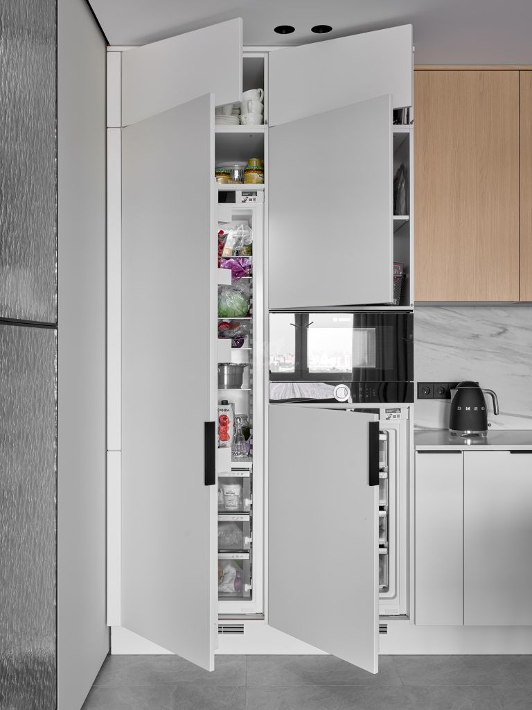 G-образная планировка позволила нам интегрировать в проект всё необходимое оборудование, сохранив при этом чистоту линий. В конструкцию включены два высоких пенала, которые взяли на себя основную функциональную нагрузку: