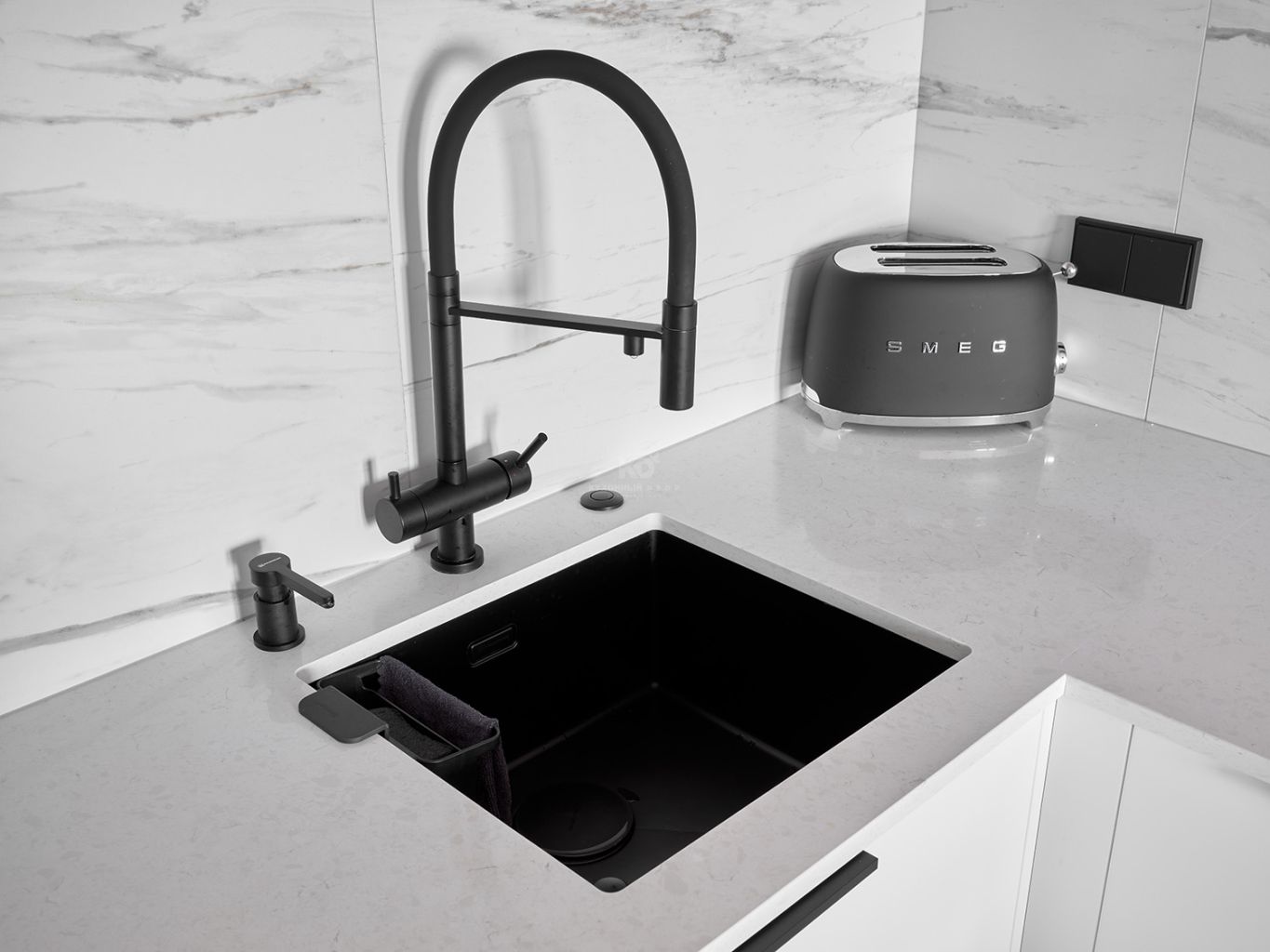 Рабочая поверхность выполнена из кварцевого агломерата. Этот камень не боится горячего и не впитывает красящие жидкости (вино, кофе, сок), что делает его идеальным спутником для тех, кто ценит чистоту и порядок.