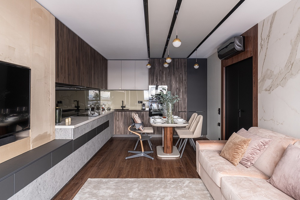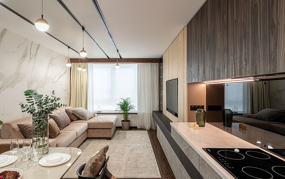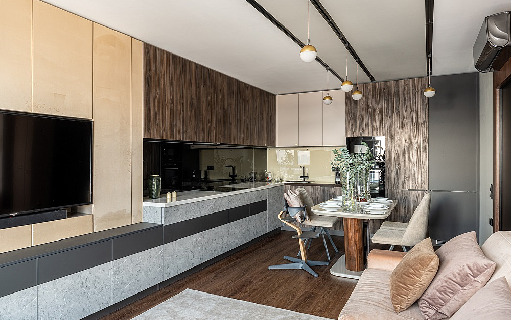 Ваша квартира находится в городской высотке, а за окном – урбанистический пейзаж? Тогда разнообразие фактур на кухне – то, что доктор прописал! Кстати, о докторах: именно для них в рамках передачи «Квартирный Вопрос» создан этот впечатляющий дизайн-проект. Екатерина – врач-кардиолог, Константин – сердечно-сосудистый хирург, а их сыновья Миша и Дима – большие мастера лечить любую печаль весёлыми играми! В этой семье каждый друг друга любит, и с делами сердечными всё обстоит замечательно! Что не хватает для полного счастья? Правильно, отличной кухни-гостиной! И «Кухонный Двор» создал именно такую!