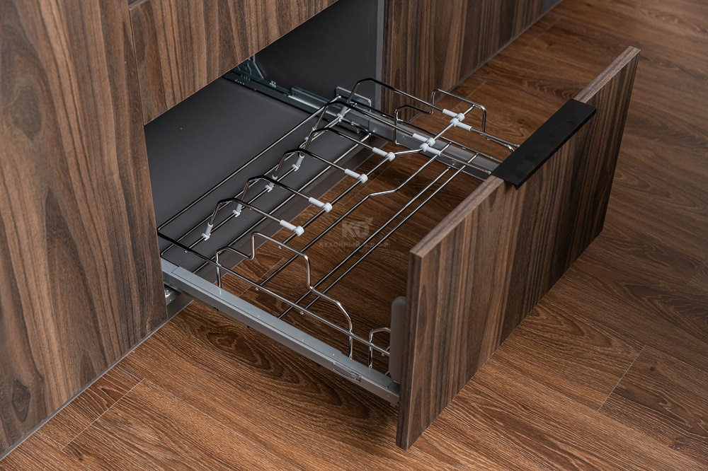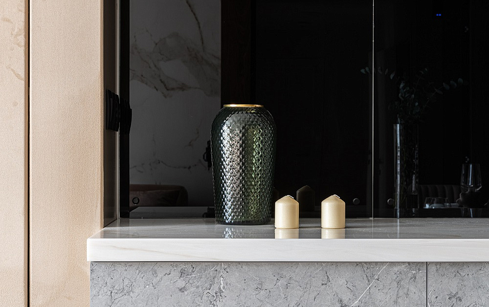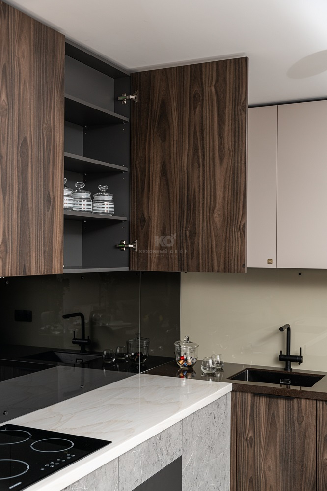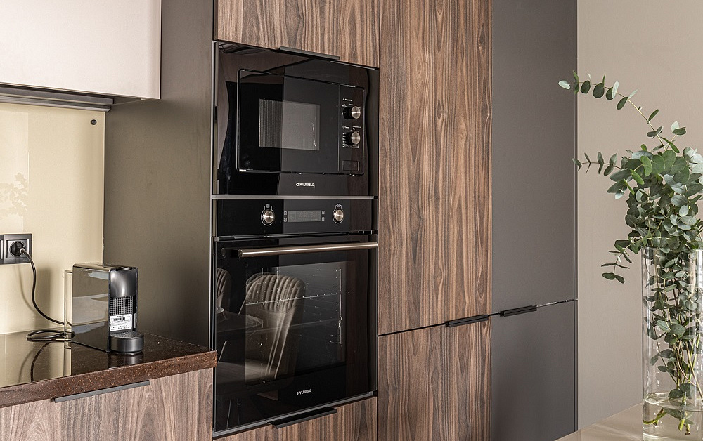Столь внушительный гарнитур просто обязан иметь достойное оснащение. Обязан, и имеет! Здесь в наличии: мощная скрытая вытяжка, индукционная варочная панель, ПММ на 14 комплектов посуды, духовой шкаф объёмом 82 л., СВЧ на удобной высоте и целых два полноразмерных холодильника! Также в распоряжении хозяев мембранная система фильтрации воды, выкатные сетки, бесчисленное множество полезных аксессуаров и колоссальный объём внутреннего пространства. Готовят здесь явно с удовольствием, а наслаждаются едой – с улыбками и комфортом!