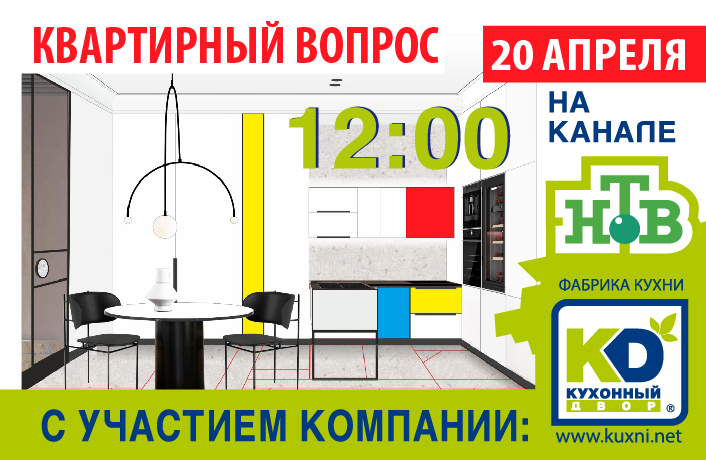 Давно не смотрели хорошую передачу про переделку интерьеров? Есть отличный шанс это исправить! «Кухонный Двор» снова выходит на большие телеэкраны, на этот раз вместе с программой «Квартирный Вопрос». Уже в эту субботу, 20 апреля Вы увидите нечто особенное! Приготовьтесь познакомиться с кухней, на создание которой нас вдохновила абстрактная живопись. Наши дизайнеры покажут, как с помощью ярких акцентов вдохнуть в интерьер настоящую страсть! Одна из самых экспрессивных новинок коллекции «KD» покажет себя во всей красе!