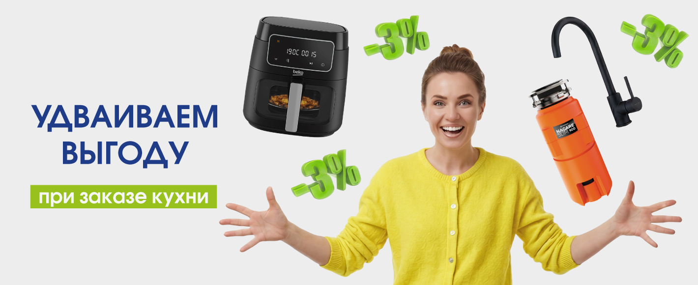 - Дополнительная скидка 3% на всю кухонную мебель — приятный бонус для вашего бюджета.
