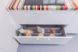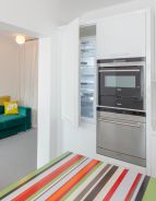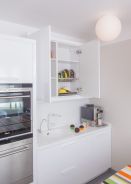 Дизайнер распланировала кухню таким образом, чтобы все было под рукой и готовить можно было, не сходя с места. Поэтому расположение мебели здесь довольно непривычное для типовых квартир – параллельное с полуостровом.Корпуса шкафов изготовлены из ламинированной ДСП белого цвета, а фасады – из покрытой белой экологичной эмалью МДФ. Вся рабочая зона кухни накрыта столешницей из искусственного камня Montelli белого цвета с небольшими вкраплениями «снежинок» – белых камушков. За счет такой пестрой расцветки удалось визуально скрыть места стыков полотен столешницы. Интегрированная бесшовная мойка сделана из того же материала. Такая конструкция очень удобна, поскольку ее легко чистить, а грязь не забивается в стыки. Мебельные секции, установленные вдоль стены, в первую очередь предназначались для установки в них бытовой техники. Достаточно буквально протянуть руку – и можно достать продукты из холодильника, разогреть их в духовом шкафу, а тарелку убрать в посудомоечную машину. Тем не менее, с этой стороны нашлось место и системам хранения. Во-первых, это шкафчики верхнего яруса, один из них предназначен для сушки. А во-вторых, в столе под мойкой установлен выдвижной двухсекционный ящик. Верхний бокс, со специальной выемкой под мойку, – небольшой и подойдет, например, для моющих средств. Под ним – полноценный комбинированный ящик для продуктов и бутылок с делителями. Справа от мойки – стол с дверкой, за которой расположена выкатная корзина и выкатное мусорное ведро. Кухонный полуостров сочетает в себе функции рабочей зоны, обеденного стола и вместительного шкафа. За белыми фасадами скрываются выкатные сетки с полками и большие ящики с удобными разделителями, а также еще один скрытый ящик для ложек и вилок. Верхняя часть столешницы полуострова размером 105х195 см выполнена из кориана 15 оттенков. Разноцветные полоски разной ширины бесшовно соединили в хаотичном порядке.